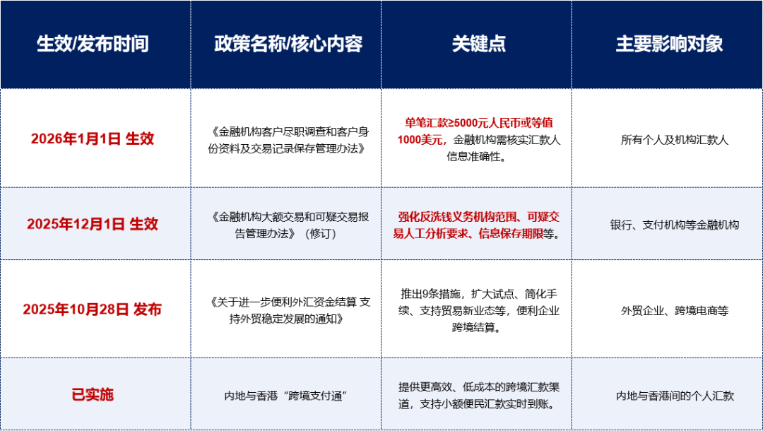 自2026年1月1日起,单笔跨境汇款≥5000元人民币或≥1000美元时,银行必须对汇款人身份信息的准确性进行核实。